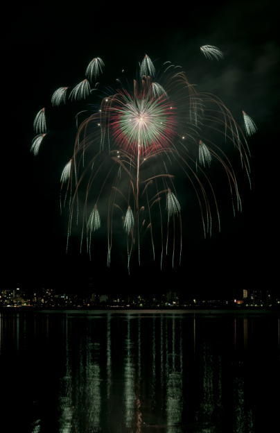 今回は、湖の漣線ギリギリのところに陣取った関係で、湖上に写る反射した花火がとても綺麗でした。