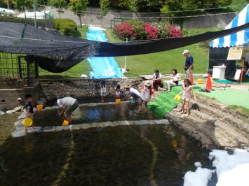 上の写真は魚のつかみ取りの様子と、採った魚をその場で塩焼きにした図。ちょっとしょっぱかったが大満足です。