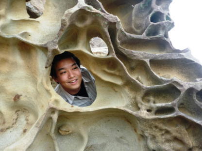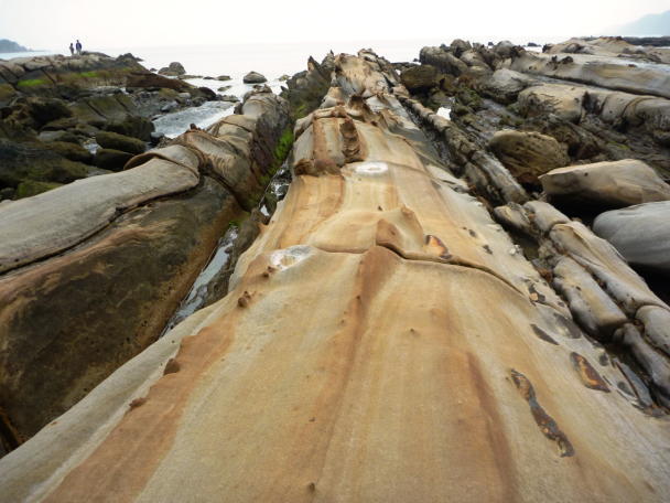 この海岸の成分は砂岩と泥岩がメインとなる。波と風の浸食によるものなら真ん中の写真や右の写真の紋様は理解が出来るがどうしても左の写真のような「穴」の謎がわからない。